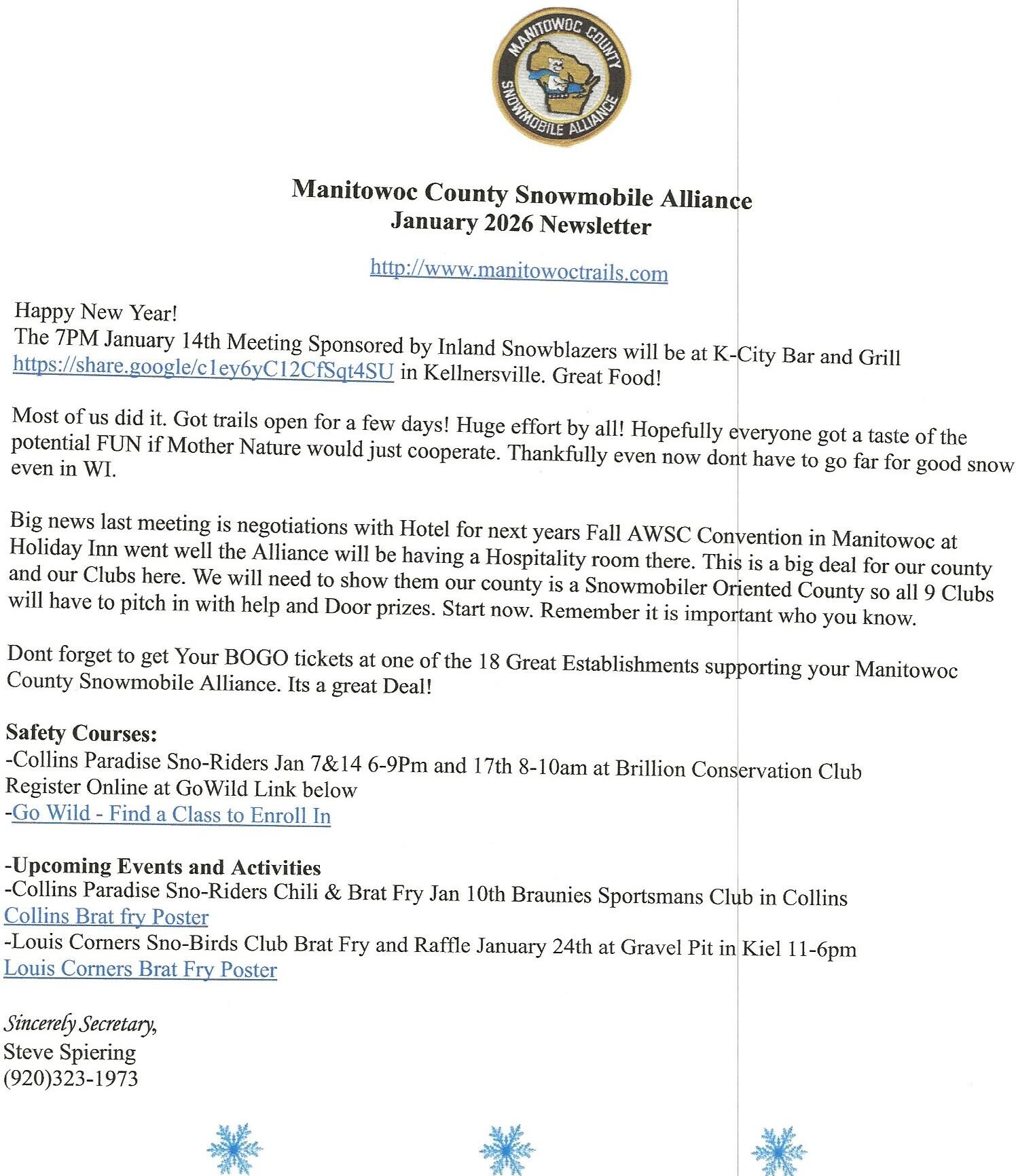 Our next meeting is Wednesday, February 11th at 7pm at Branch Station in Branch, sponsored by the Lakeshore Snowmobile Club. Directions Here
