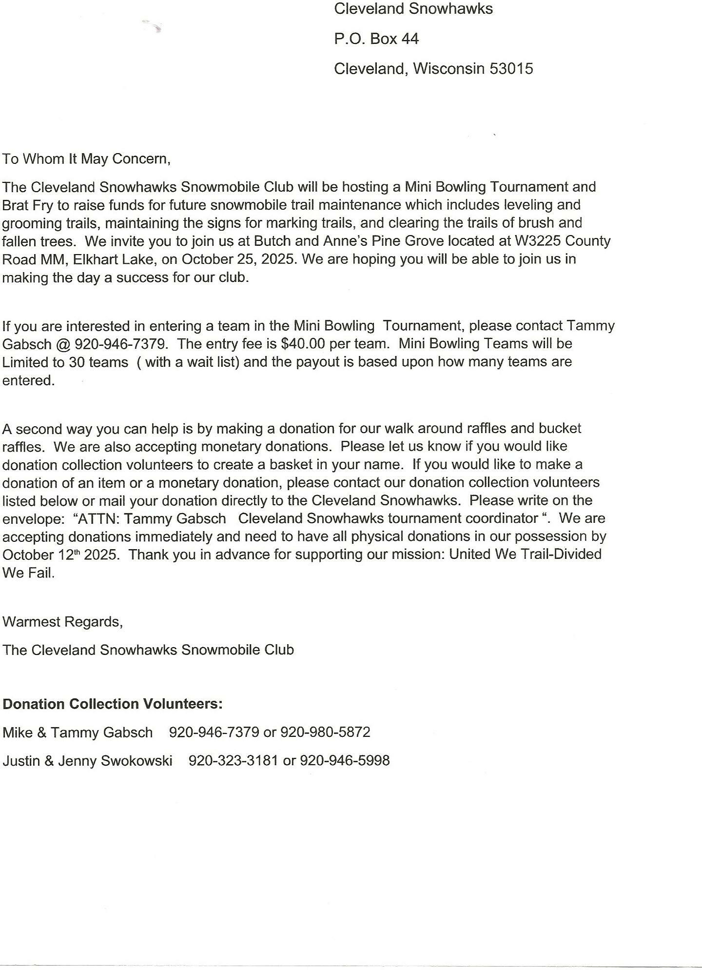 « All Events This event has passed. Mini Bowling Tournament & Brat Fry October 25, 2025 @ 10:00 am - 5:00 pm « All You Can Eat Steak Fry Kettle Range Snowmobile Safety Class – Day 1 » Contact Tammy Gabsch for details if you are interested in entering a team. Add to calendar Google Calendar iCalendar Outlook 365 Outlook Live Details Date: October 25, 2025 Time: 10:00 am - 5:00 pm Organizer Cleveland Snow Hawks Venue Butch & Annie’s Pine Grove, WI United States + Google Map